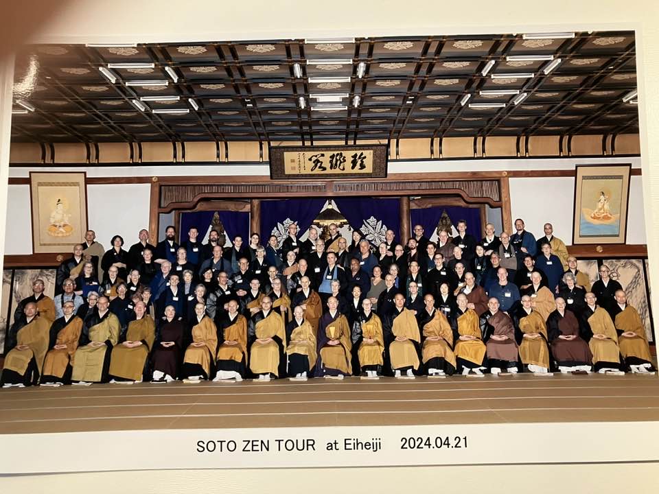 So I had this amazing trip to Japan in April 2024. Everything was a whirlwind from the arrival at Haneda Airport, to the 13th floor outdoor hot baths at my arrival hotel. There were fun days in Kyoto with Sangha members trying to figure out where to find vegetarian food, missing buses, taking buses the wrong direction to where we wanted to go, almost missing our train to meet up with the 100 person Soto Zen Clergy Tour Group for our first stop – to see Dogen Zenji’s Temple in the Mountains Eiheiji. Imagine my surprise when the group photo was being set up to have my name called to sit in the front row (5th from left). I am in the dark brown Okesa. This group had some serious Soto Zen weight and they added little ole me to the front row. How amazing is that?